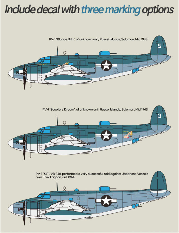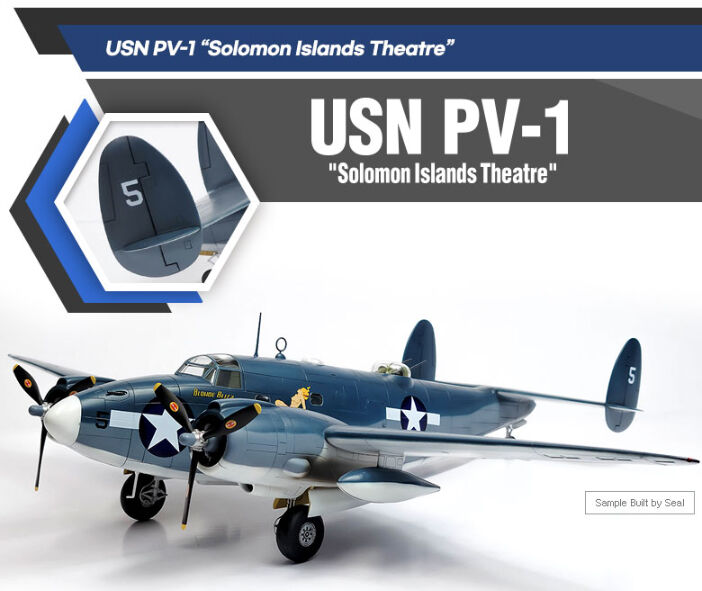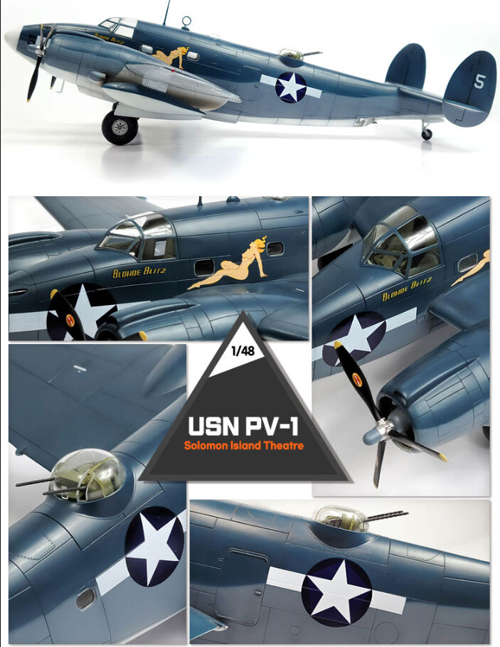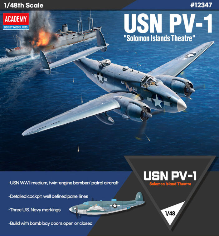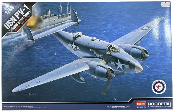 Optional open or closed canopy sections, detailed bomb bay, and clear parts for windows and observation panels enhance display options. With accurate proportions, surface details, and ordnance mounting options, this kit provides an engaging build for WWII aviation enthusiasts. Once completed, the Academy 1/48 PV-1 Ventura makes a striking display model, celebrating the aircraft’s critical role in the Solomon Islands campaign.