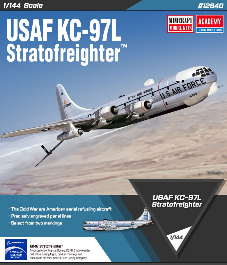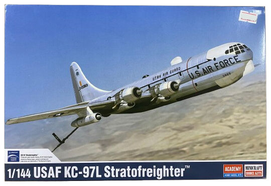 The Academy 12640 USAF KC-97L Stratofreighter 1/144 Scale Plastic Model Kit delivers a finely detailed replica of the legendary Boeing tanker and transport aircraft that served during the Cold War era. This kit accurately captures the KC-97L’s distinctive refueling pods, four powerful radial engines, and the aircraft’s sleek, high-wing profile.