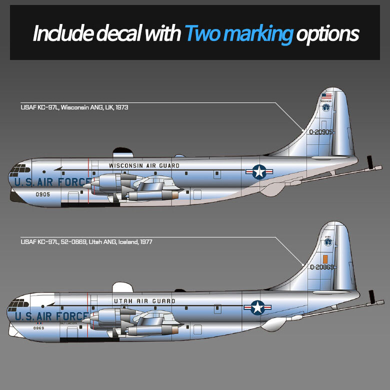 Molded in crisp, high-quality plastic, the model includes finely recessed panel lines, detailed landing gear, and optional parts to build either the refueling or transport configuration. The kit also features authentic USAF markings that bring the Stratofreighter’s service history to life, making it a perfect addition for aviation modelers interested in post-war and early jet-age aircraft.