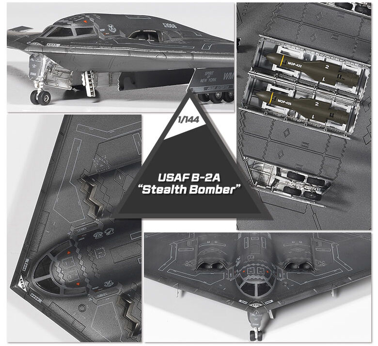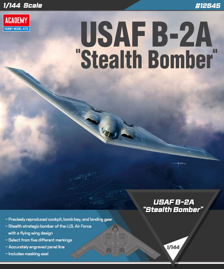 The Academy 12645 USAF B-2A "Stealth Bomber" 1/144 Scale Plastic Model Kit offers a highly detailed recreation of one of the most advanced aircraft ever built. Known for its unique flying wing design and radar-evading stealth technology, the B-2A Spirit is a symbol of cutting-edge aerospace engineering and modern air power.