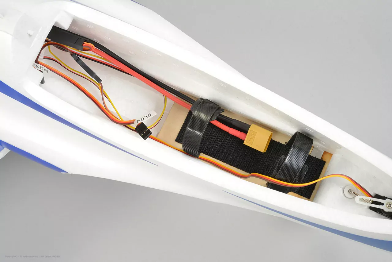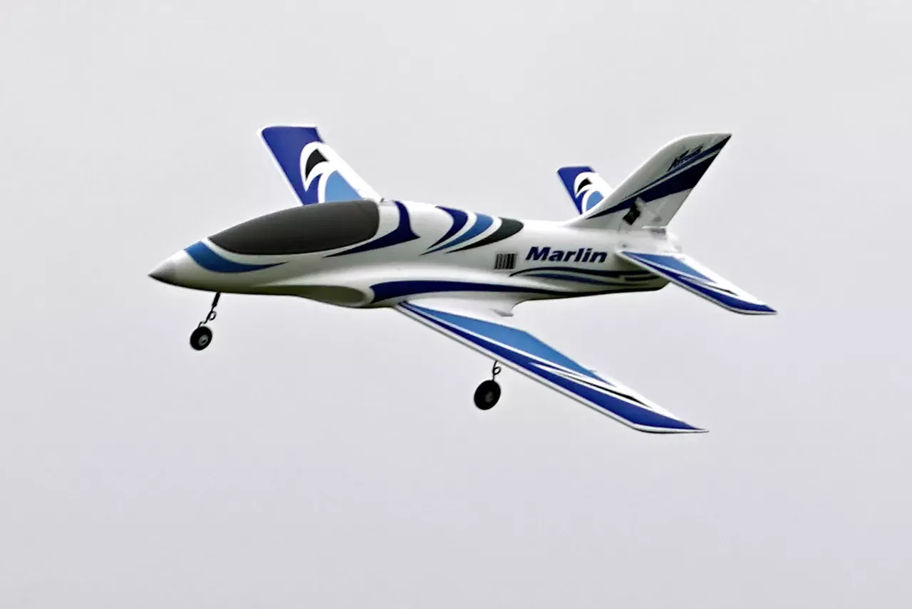 Powered by a 2840 motor, 40A ESC, and an 11-bladed 64mm EDF unit, the Marlin delivers ample power and produces a thrilling engine note throughout your flights. Assembly is a breeze, as the screw-together design enhances fuselage rigidity while reducing build time. The full-flying horizontal stabilizer ensures precise pitch movements, while ball linkages provide smooth surface control.