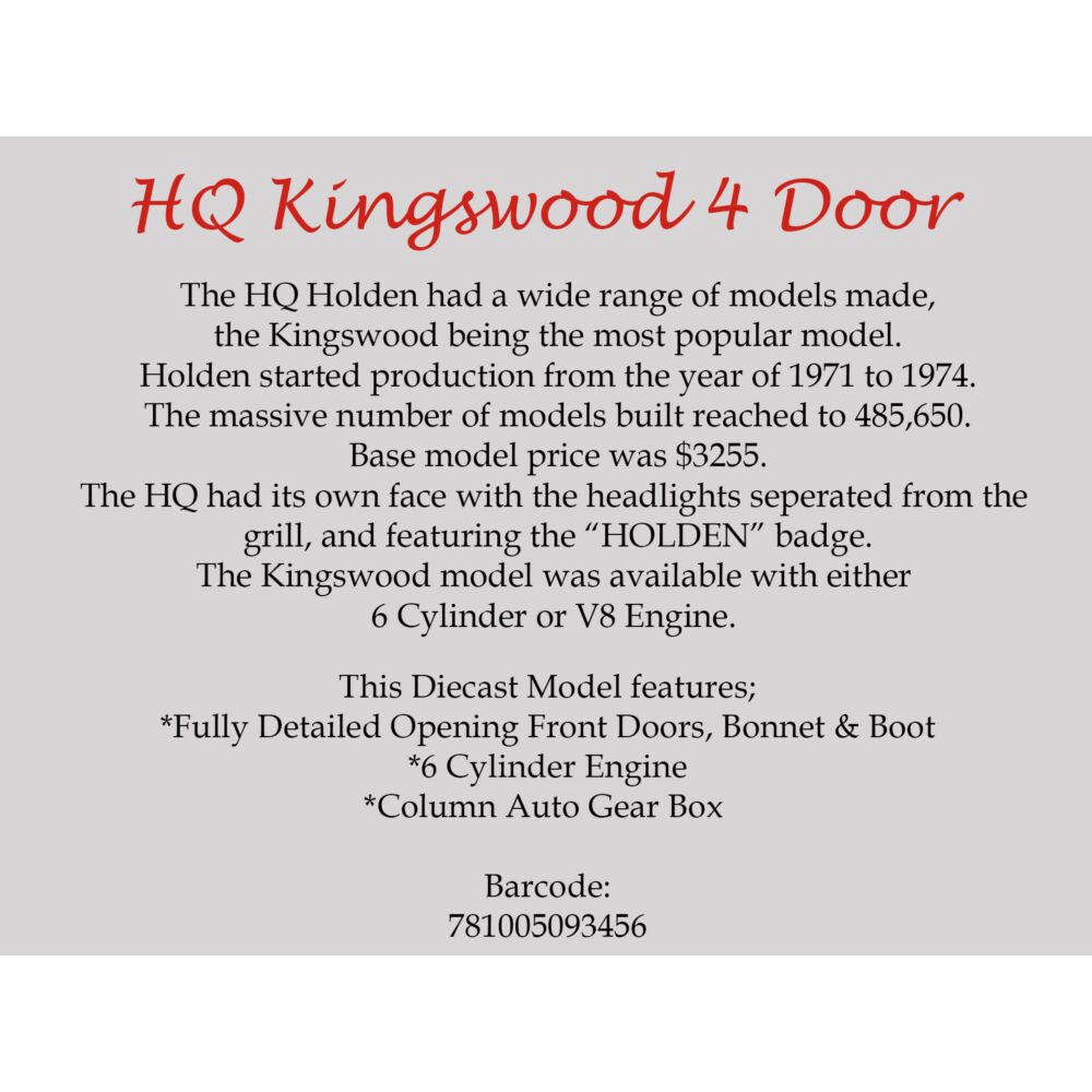 Celebrate a true icon of Australian motoring with this 1/24 scale Holden HQ Kingswood 4-Door by DDA Collectibles. First released in the early 1970s, the HQ Kingswood became a household name across Australia, known for its reliability, comfort, and timeless design.