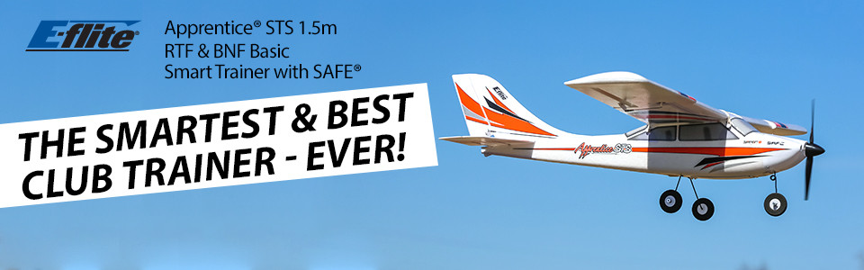 The Smartest And Best Club Trainer – Ever!E-flite® took the world's favorite club trainer and made it SMARTER with the Apprentice® STS (Smart Trainer with SAFE) 1.5m. Based on one of the best platforms ever designed for learning to fly radio-controlled (RC) airplanes, its large size and 1.5 meter (59.0 inch) wingspan offer better visibility and the ability to handle more wind while learning to fly at an RC club flying field. Its inherently stable design plus SAFE® (Sensor Assisted Flight Envelope) technology featuring Beginner, Intermediate, and Experienced flight modes make it easy to fly successfully, especially with the help of an instructor. Best of all, it has the option to upgrade to SAFE Plus GPS-enabled technology offering features such as AutoLand and Virtual Fence, plus the option to install the Landing Assist Sensor (LAS) that automatically "flares" for smoother landings to make learning to fly—and to land safely—easier than ever! The tricycle landing gear makes it possible to take off from and land on a variety of surfaces, including grass, dirt, paved runway, and other suitable surfaces, or you can install the optional floats to fly from water. Plus, it's equipped with a 30-amp telemetry-capable ESC that provides a variety of real-time power system related telemetry data, including motor RPM, current, battery voltage, and more to compatible Spektrum™ AirWare™ equipped transmitters, and even approximate flight battery power remaining via multiple LEDs on the DXS transmitter included with the RTF Basic version. The Apprentice STS 1.5m is the smartest and best club trainer ever, and that makes it perfect for first-time pilots, experienced pilots that teach others to fly, and club training programs alike. It's also the best choice for new pilots seeking a larger trainer that makes it easier to progress into more advanced RC airplanes! The Ready-To-Fly (RTF) Basic version includes everything needed to fly in one box except for a battery and charger. This allows you to choose a convenient and money-saving Spektrum™ Powerstage bundle or the separate battery and charger you prefer. Plus, the included Spektrum DXS 2.4GHz transmitter can be used with other Bind-N-Fly® (BNF) and BNF Basic aircraft after you learn to fly successfully! A BNF Basic version is also available for experienced pilots who want to use their favorite Spektrum transmitter along with batteries and chargers they may already own. For both versions, the powerful and efficient brushless power system, including a telemetry-capable ESC, flight controller, receiver, and servos, is factory-installed in the durable EPO airframe that assembles quickly and easily without the need for glue or special tools. And the fun doesn't stop after you learn how to fly! In the Experienced Mode, the Apprentice STS can perform aerobatic maneuvers including loops, rolls, inverted (upside down) flight, and more. You can even use the same DXS transmitter that's included with the RTF Basic version, along with the same battery and charger you use for the Apprentice, to fly a variety of BNF Basic version "Next Step" aircraft including the E-flite® T-28 Trojan 1.2m, the Turbo Timber Evolution 1.5m and others! You can also purchase the RealFlight Trainer Edition RC Flight Simulator and a Spektrum WS2000 Wireless Simulator Dongle (sold separately) to fly this and other models using the transmitter included with the RTF Basic version. The simulator features many of the most popular Horizon Hobby trainer aircraft and built-in Virtual Flight Instructor lessons. This helps new pilots learn to fly successfully by practicing on a PC at home or on a laptop just about anywhere else! |