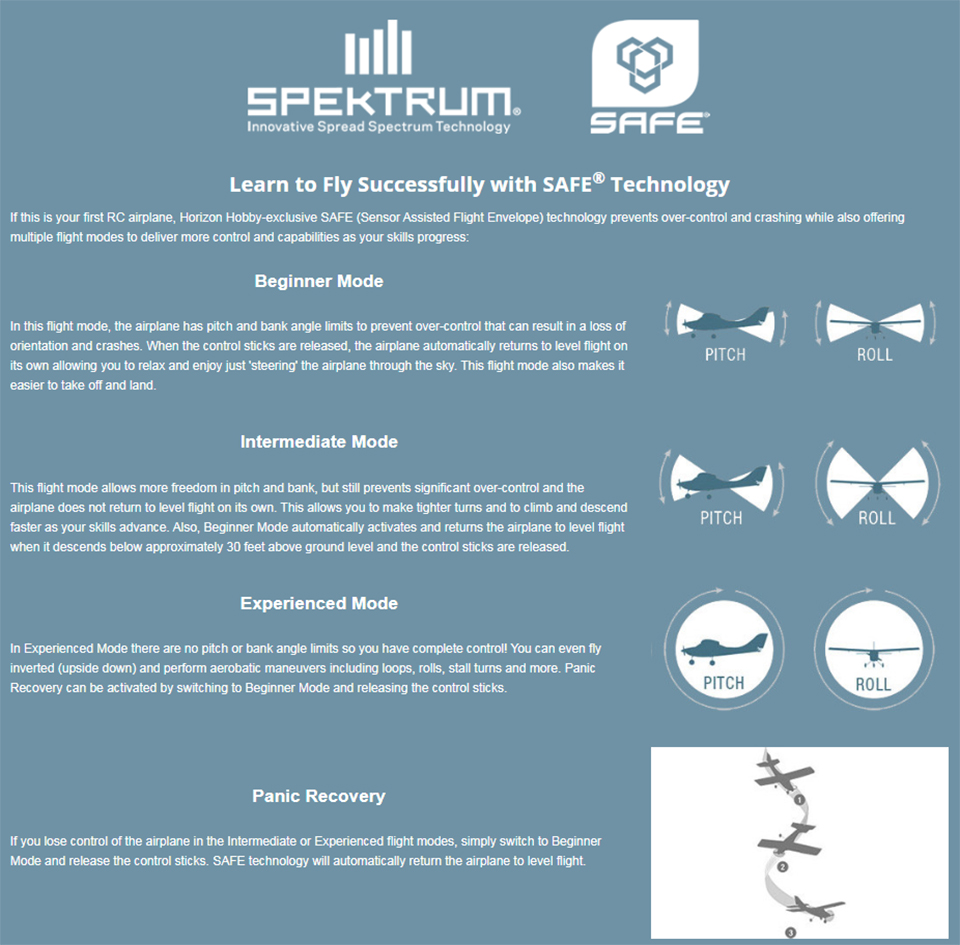 Easily Upgrade to SAFE® Plus GPS-Enabled TechnologyWith quick and easy installation of the optional Spektrum GPS Module (SPMA3173; sold separately), you can add next-level autonomous guidance features that make it even easier to learn to fly. With SAFE Plus added, you get: AutoLandActivated by simply holding down a button, the advanced AutoLand function puts the airplane on a stabilized approach to land on its own near the GPS initialization point. You can even provide some directional guidance to avoid obstacles or to adjust the approach while letting the system do the rest to execute a safe landing. As your skills progress and you gain more confidence, you can take over more control inputs, eventually learning to land without any assistance from the automated system. Holding PatternThis beneficial SAFE Plus-exclusive feature allows you to "pause" the flight by putting the airplane into a GPS-guided holding pattern. When activated with the quick press of a button, the aircraft will automatically return to a position above the GPS initialization point and circle until the command is canceled with another quick press of the button. It's a great way to safely hand the controls off to a friend or regain visual contact if you ever lose sight of the model. Virtual FenceIt's easy to accidentally let an RC airplane fly too far away, but with Virtual Fence, worry no more! It creates an invisible boundary the airplane won't fly past. When the plane reaches this boundary, it will automatically turn around and fly back toward the GPS initialization point. Then it will "wag" the wings to let you know when you have control again.