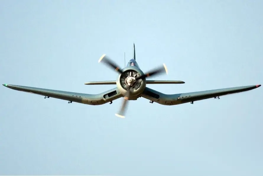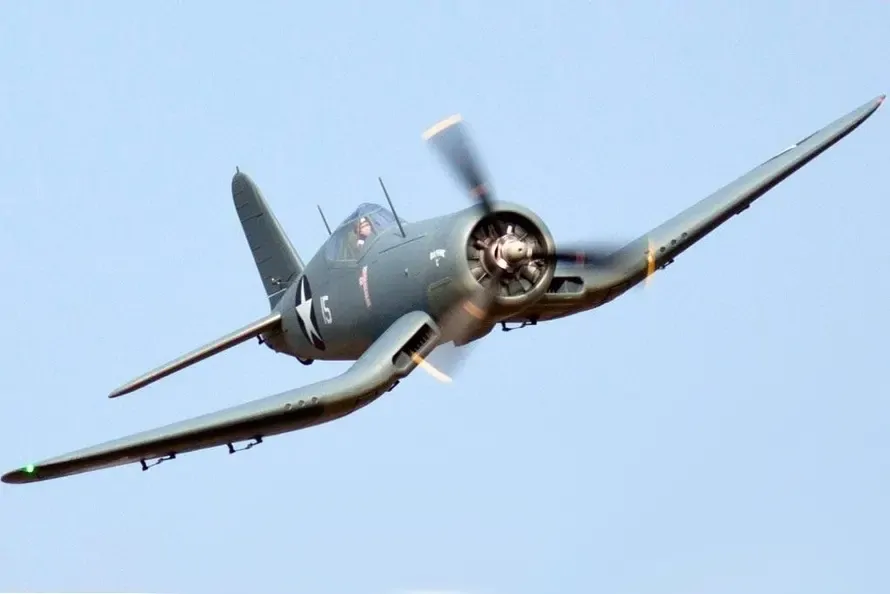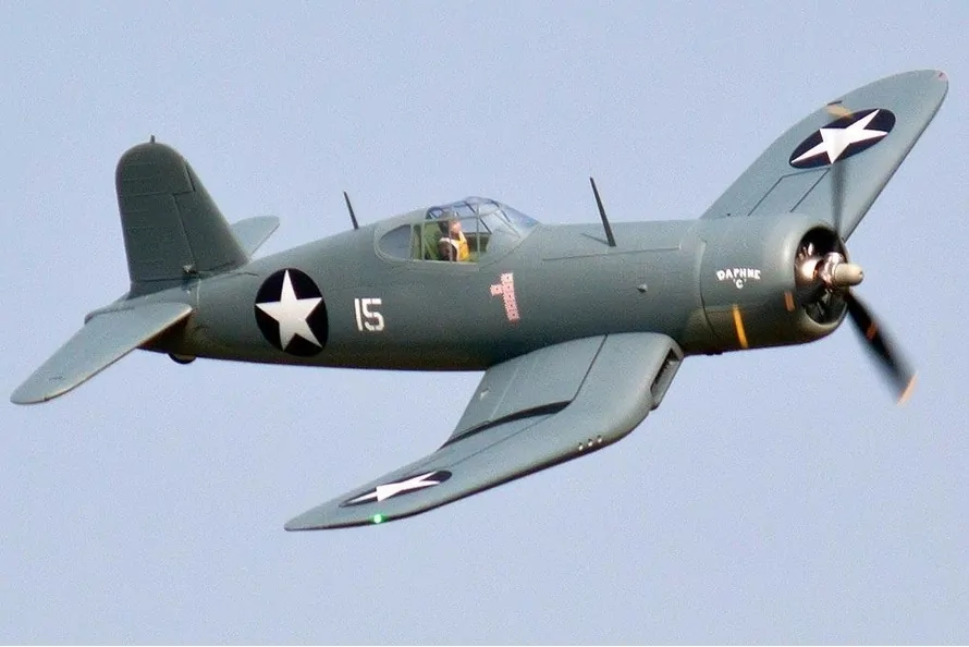 The F4U Corsair was a carrier-based and land-based aircraft developed during WWII. Its unique inverted sea-gull wing is its distinctive feature, as well as its maneuverability and versatility to operate in many areas. Its powerful engine, producing a top speed of 640 kph, made the Corsair one of the fastest piston fighters in the world at that time. In the Pacific battlefield, it achieved an impressive 11:1 combat record. The Corsair remained in military service after WWII into the Korean war era and several continue to fly today with civilian operators.
