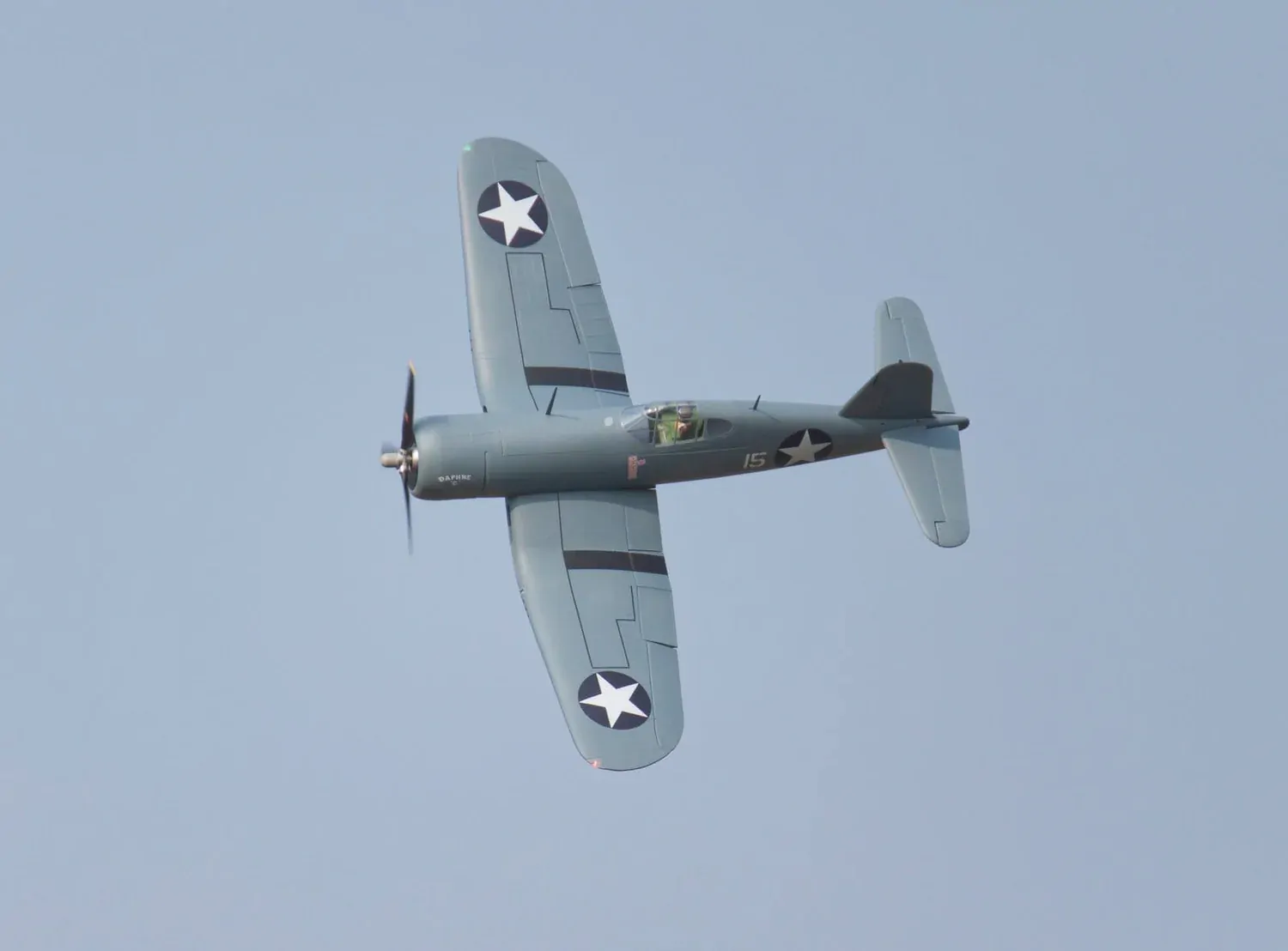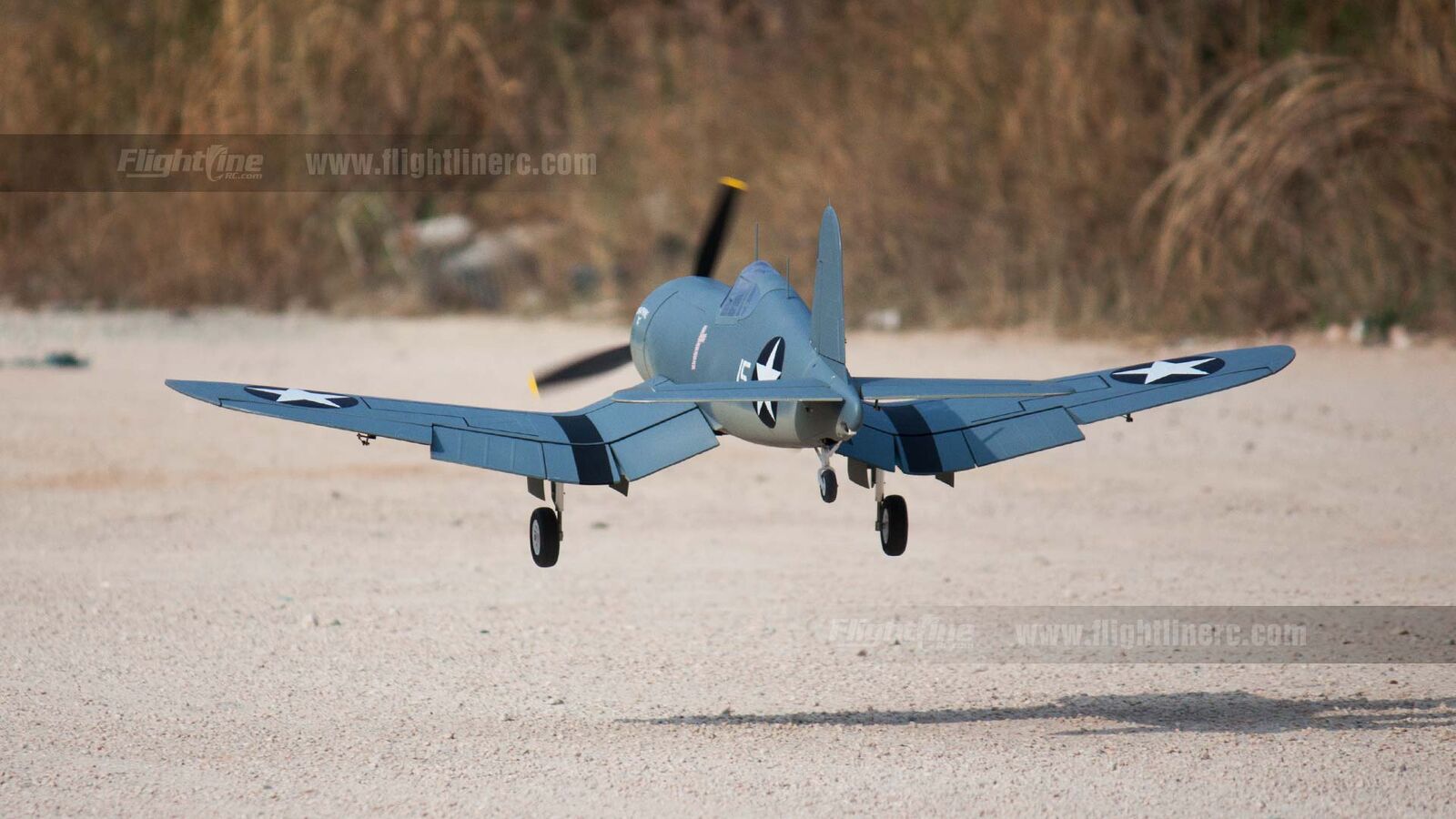 Takeoff is very stable without the need for flaps. The F4U can execute a wide range of maneuvers, including all scale maneuvers and additional non-scale aerobatics. Its aluminum suspension main struts and tall wheels provide confidence when operating on grass runways. All three landing gear are retractable, and the mains even feature three panel sequenced molded plastic gear doors for ultimate realism.