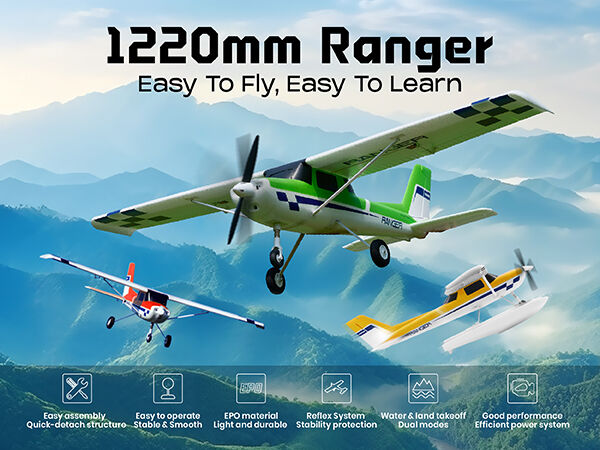 The Perfect RC Airplane For BeginnersAs the newest member of the FMS multi-purpose aircraft lineup, the 1220mm Ranger V3 retains all of the fantastic features that pilots have come to expect from FMS stable flight characteristics, ease of assembly, and realistic general-aviation inspired design. Built with ultralight EPO foam, the large high-winged airframe configuration gives the Ranger stable flight characteristics and low wing-loading with extraordinary amounts of lift, even at slow speeds. Robust plastic struts give extra strength to the wings during aerobatic maneuvers and the patented high-strength “crash-proof” spring cushioned nose landing gear makes ground handling a breeze. A great aircraft is nothing without a great, dependable power system. FMS has equipped the ranger with a 3136/1200KV outrunner motor with 20A Predator ESC, which allows the ranger to climb almost vertically on demand! Featuring red, yellow, or green color schemes, the ranger can always be easily orientated even in overcast weather. Designed specifically for beginner pilots, the ranger boasts effortless assembly. Requiring only several screws and twist-locks to complete assembly, the longest wait time is the time it takes to charge the battery! Additionally, the two-piece design of the fuselage and main wing reduces packaging size by thirty percent, facilitating easy transport and storage! Reflex V3, an onboard flight stabilization system, is factory installed. The Reflex system features Stabilized, Optimized and Manual flight modes. Reflex V3 is a trusty co-pilot that is perfect for pilots of any skill level. Don’t miss out on one of the most revolutionary FMS aircraft, the amphibious ranger V3 Features
