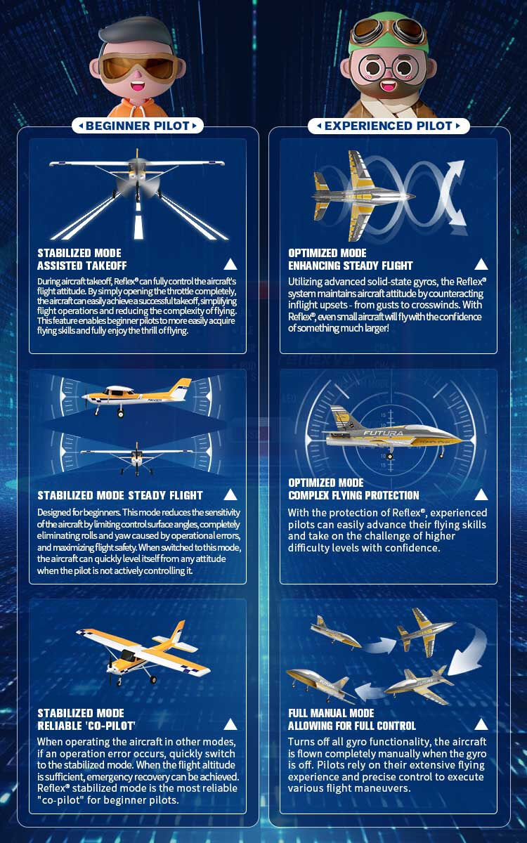 Stabilized Mode - Designed for beginners. This mode reduces the sensitivity of the aircraft by limiting control surface angles, completely eliminating rolls and yaw caused by operational errors, and maximizing flight safety. When switched to this mode, the aircraft can quickly level itself from any attitude when the pilot is not actively controlling it. Reflex® stabilized mode is the most reliable "co-pilot" for beginner players.