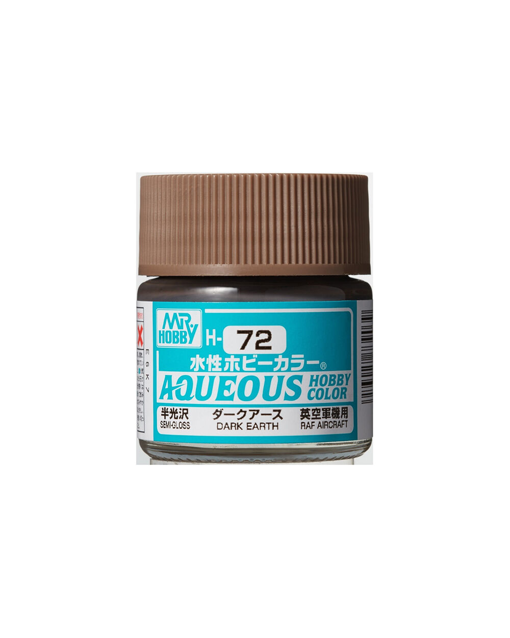 H72 Semi-Gloss Dark Earth Aqueous Hobby Color is a very safe paint that has a high degree of user-friendliness. Aqueous Hobby Color paint can be diluted with water if desired, while paint brushes can be cleaned and washed out in the water. Ensuring that this is before the paint is dry. The solvent contained in Aqueous Hobby Color paint is very mild.