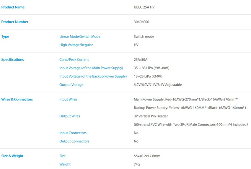 UBEC. Output voltage adjustable between 5.0V, 6.0V, 7.4V and 8.4Vmeets
