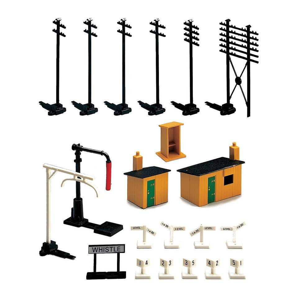 The Trackside Accessories pack improves any railway layout with a selection of realistic scenic elements. The comprehensive set includes three trackside huts, nine mile and gradient posts, six telegraph poles, a loading gauge, water crane, and whistle board. Each accessory is meticulously crafted to capture the essence of traditional railway infrastructure, making the pack perfect for elevating the realism of your layout.