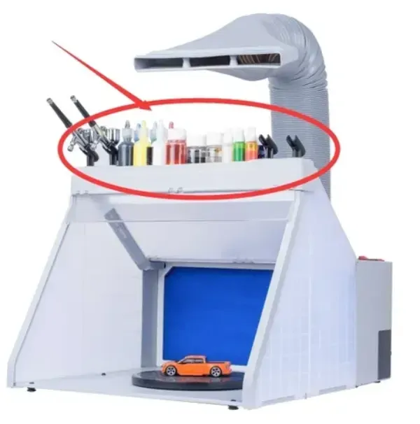 Now includes redesigned 90 deg exhaust tube and product shelf to hold paints and four airbrush holders.