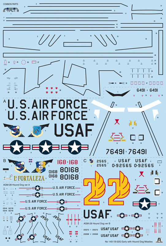 The B-52 Stratofortress is the most famous long-range jet-powered strategic bomber in the aviation history. Produced by the American company Boeing since 1955 it has been, for a long time, a symbol of the Cold War. It has been, for several years, the backbone of the United States Air Force Strategic Air Command. The B-52 has been produced in a significant number of versions that has gradually evolved the successful project to better answer to the changing in operational needs. The “G” version is the most produced B-52 variant, and it has been delivered to the S.A.C. wings from the early 60s. It could be armed with the North American AGM-28 Hound Dog stand-off air-to-surface nuclear missile that was part of the US nuclear arsenal until the mid-1970s. It was developed in the middle of the "Cold War" to carry out nuclear attacks on high priority land targets such as air and missile bases