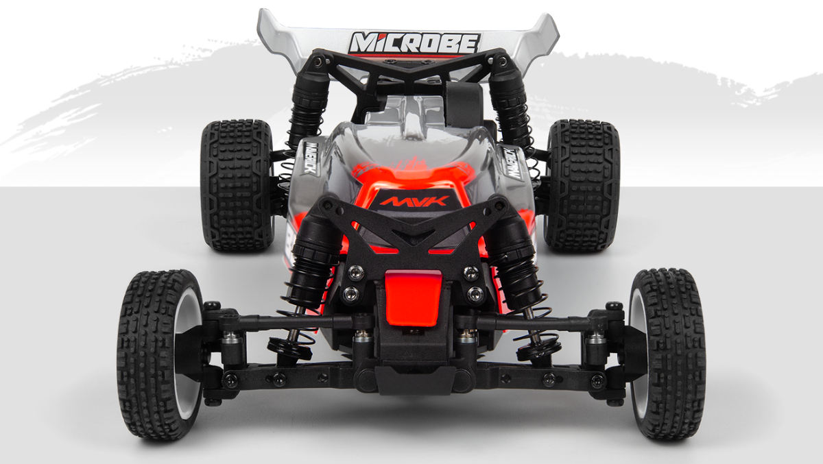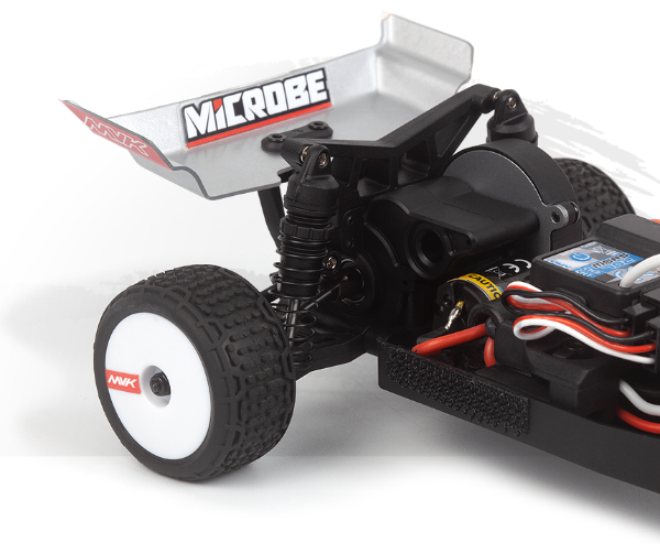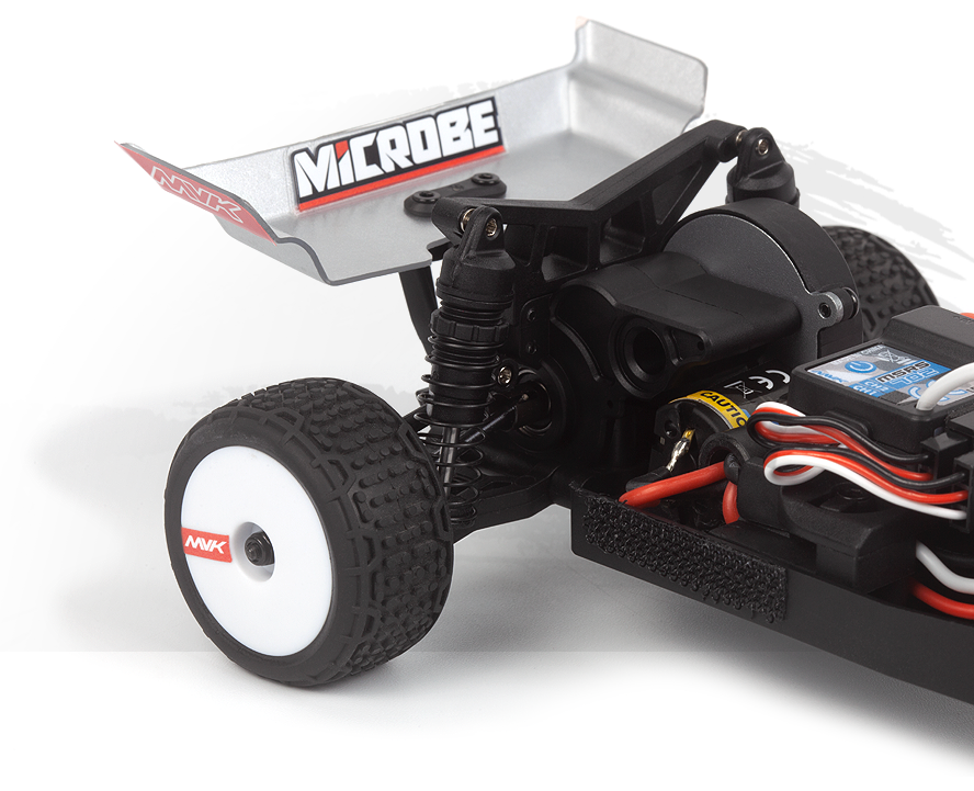 Putting the power down is the Microbe’s specialty, thanks to a tough drivetrain and a planted rear end that’s built to race. Metal outdrives, axles and rear dogbones team up with a sealed 3-gear differential and metal top layshaft gear to deliver smooth, consistent drive you can rely on, run after run. Out back, the oil-filled coilover shocks and carefully tuned rear suspension geometry keep the tires pressed into the surface, soaking up bumps and landings without upsetting the car. The result is a tiny buggy that feels solid, responsive and driveable at the limit—built to handle everything from parking-lot bashing to serious micro racing. |