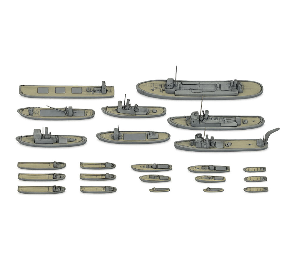 This set includes tugboats and small craft that operated in military harbors. These include transports which moved material and personnel, motor launches for liaison, rescue craft to assist downed airmen, tugboats, training and rescue cutters, and smaller transport craft. With such a variety, they will certainly come in handy for various dioramas.