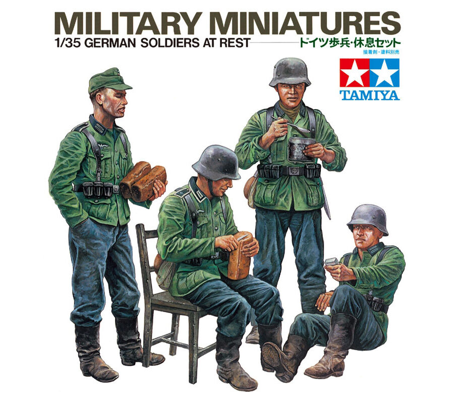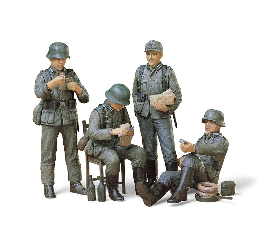 Tamiya 35129 German Soldiers at Rest 1/35 Scale Figure Set recreates four WWII German soldiers taking a break from combat, making it an excellent addition to military dioramas and a natural companion to Tamiya’s 1/35 German armour kits.