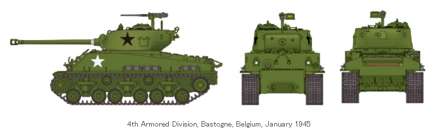 | An Easy Ride The U.S. M4 Sherman tank was undoubtedly one of the symbols of WWII, deployed in great quantities and numerous variants to counter the potent threat of German armor. One such variant was the M4A3E8, which was one of the final Sherman types and thus had the benefit of design improvements developed from experience in battle. These included a hardy welded late production hull, plus the welcome addition of the 76mm main gun. It was also fitted with new Horizontal Volute Spring Suspension (HVSS), and wider tracks, making for the significantly more comfortable ride that led to the M4A3E8's nickname of "Easy Eight." They were thrown into their maiden operation in the Battle of the Bulge in December 1944 as part of the 4th Armored Division under General Patton's overall command, contributing to the relief of the besieged town of Bastogne and the eventual triumph of the Allies in the European Theater. |