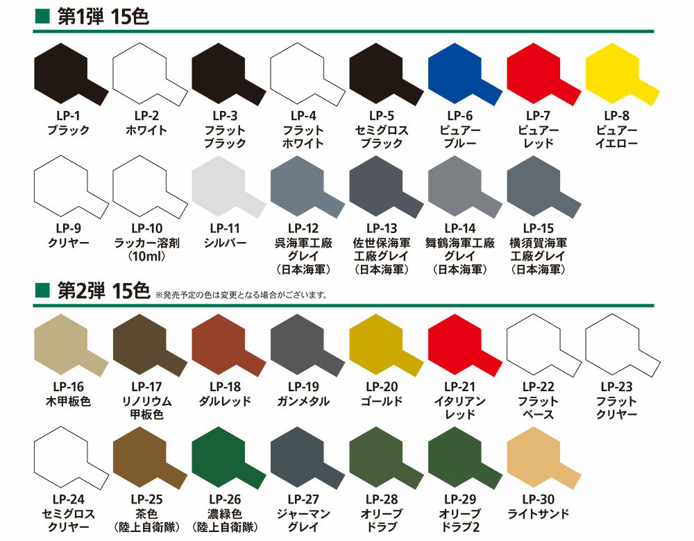 *Colors may vary slightly from Tamiya Color Acrylics and Sprays with the same name.