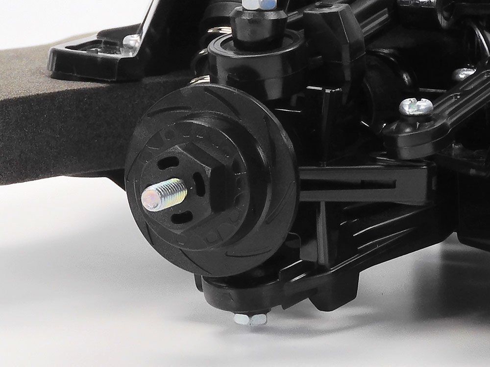 The shaft-driven 4WD TT-02 chassis employs a longitudinal layout with the battery on the left and the motor on the right, to give excellent stability. In addition, it features identical left and right suspension arms and uprights for ease of assembly, plus easy-to-maintain gearboxes. It is a highly adaptable chassis, as it offers 2 different wheelbases, 2 ground clearance settings and 2 tread set-ups in addition to a range of 10 possible gear ratios. It is not short on looks either, with brake disc-shaped wheel hubs and stylish front bumper supports. Black mesh design wheels use semi-pneumatic slick tires.