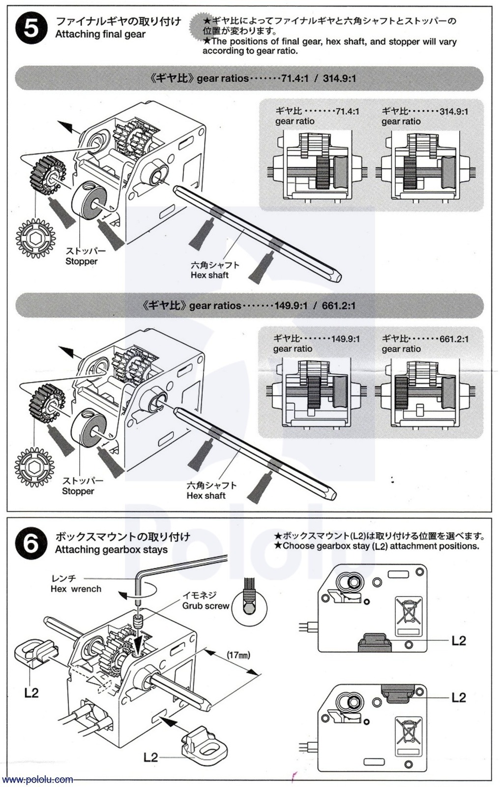 Tamiya’s 4-speed low-speed mini motor gearbox features a more compact 030-form-factor brushed DC motor driving a single gear train that can be assembled to have one of four gear ratios: 71.4:1, 149.9:1, 314.9:1, or 661.2:1. The gear train includes a self-locking worm gear.