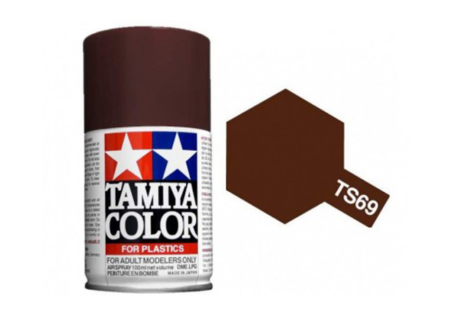 Tamiya TS-69 Linoleum Deck Brown #85069 These cans of spray paint are extremely useful for painting large surfaces. The paint is made up of a synthetic acrylic lacquer that cures in a short period of time. Each can contains 100ml of paint, which is enough to fully cover 2 or 3, 1/24 scale sized plastic model car bodies. Tamiya spray paints are not affected by acrylic or enamel paints. They may be applied over a cured spray painted surface.