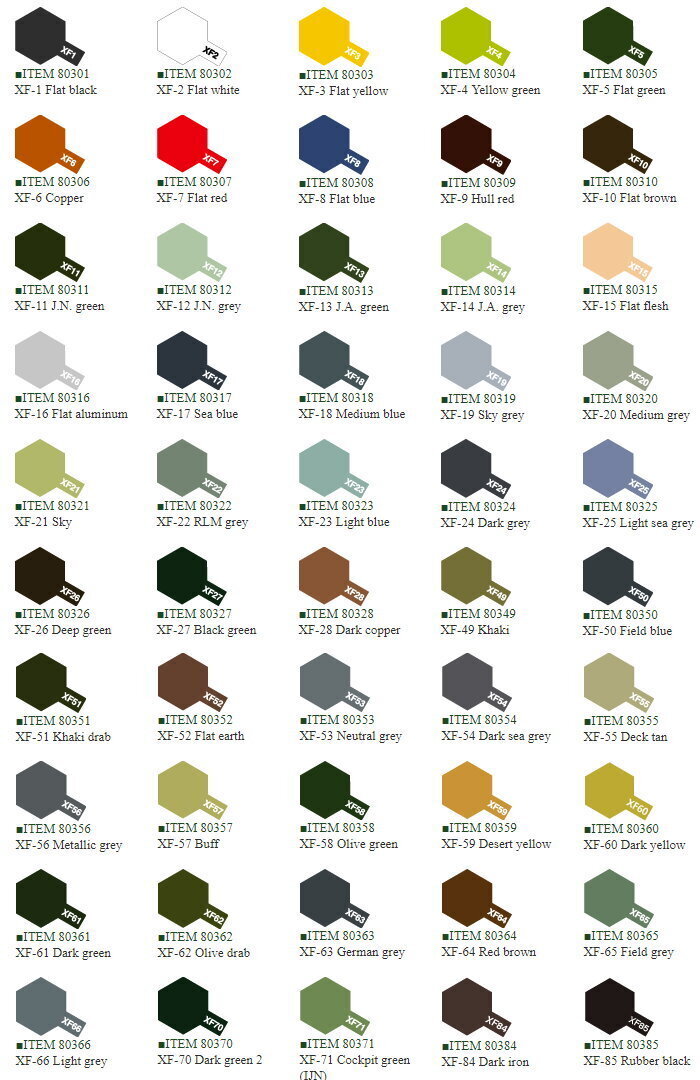 Tamiya Color Enamel Paints are used for brush or spray painting, and can be applied to almost any surface of wood, metal or plastic. Each bottle contains 10ml of paint, and when spray painting enamels, best results are achieved by adding 2 parts of thinner to 10 parts of paint.