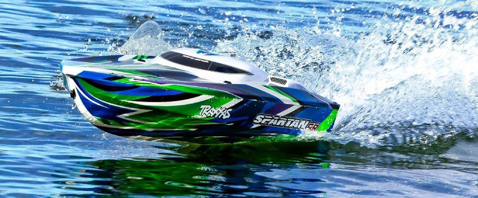 Spartan is the kind of boat you expect from Traxxas. Its 50+mph fury makes even the most insatiable, power-hungry enthusiasts jump up and take notice. Spartan means business with its super-rigid, 36-inch deep-V hull, smooth, cable-drive efficiency, innovative water cooling system, and precision aluminum and stainless steel drive controls. The clean, modern hull design is built up in layers for maximum rigidity and its bold paint makes a statement on the water. The integrated battery trays secure a wide variety of battery packs from 8.4V NiMH |